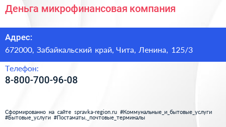 Деньга, микрофинансовая компания по адресу 672000, Забайкальский край, Чита, Ленина, 125/3 в дальнейшем Организация, размещена в следующих категориях: