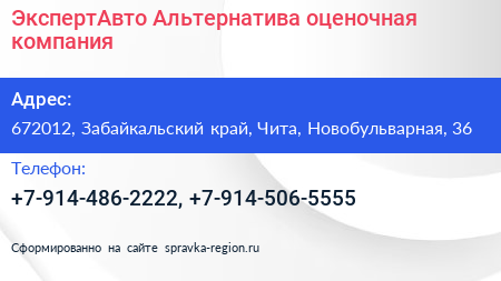 ЭкспертАвто-Альтернатива, оценочная компания по адресу 672012, Забайкальский край, Чита, Новобульварная, 36 в дальнейшем Организация, размещена в следующих категориях: