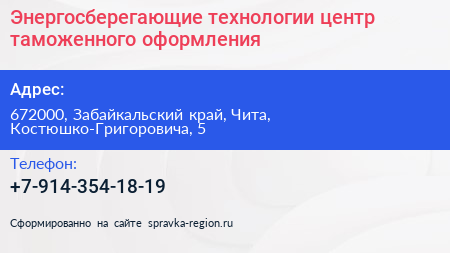 Энергосберегающие технологии, центр таможенного оформления по адресу 672000, Забайкальский край, Чита, Костюшко-Григоровича, 5 в дальнейшем Организация, размещена в следующих категориях: