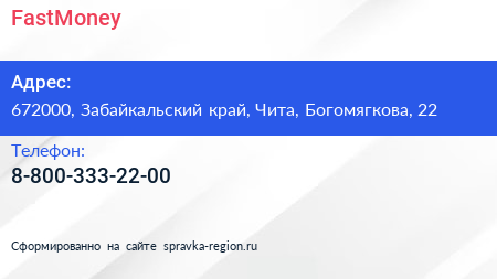 FastMoney по адресу 672000, Забайкальский край, Чита, Богомягкова, 22 в дальнейшем Организация, размещена в следующих категориях: