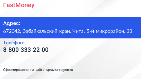 FastMoney по адресу 672042, Забайкальский край, Чита, 5-й микрорайон, 33 в дальнейшем Организация, размещена в следующих категориях: