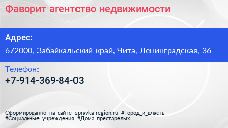 Фаворит, агентство недвижимости по адресу 672000, Забайкальский край, Чита, Ленинградская, 36 в дальнейшем Организация, размещена в следующих категориях:
