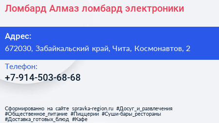 Ломбард Алмаз, ломбард электроники по адресу 672030, Забайкальский край, Чита, Космонавтов, 2 в дальнейшем Организация, размещена в следующих категориях: