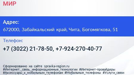 МИР по адресу 672000, Забайкальский край, Чита, Богомягкова, 51 в дальнейшем Организация, размещена в следующих категориях: