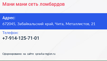 Мани-мани, сеть ломбардов по адресу 672045, Забайкальский край, Чита, Металлистов, 21 в дальнейшем Организация, размещена в следующих категориях:
