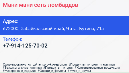 Мани-мани, сеть ломбардов по адресу 672000, Забайкальский край, Чита, Бутина, 71а в дальнейшем Организация, размещена в следующих категориях: