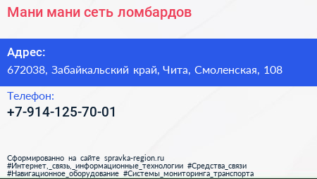 Мани-мани, сеть ломбардов по адресу 672038, Забайкальский край, Чита, Смоленская, 108 в дальнейшем Организация, размещена в следующих категориях: