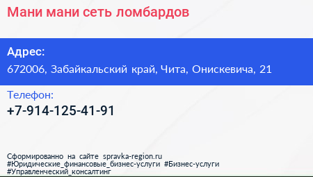 Мани-мани, сеть ломбардов по адресу 672006, Забайкальский край, Чита, Онискевича, 21 в дальнейшем Организация, размещена в следующих категориях:
