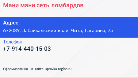 Мани-мани, сеть ломбардов по адресу 672039, Забайкальский край, Чита, Гагарина, 7а в дальнейшем Организация, размещена в следующих категориях: