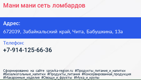 Мани-мани, сеть ломбардов по адресу 672039, Забайкальский край, Чита, Бабушкина, 13а в дальнейшем Организация, размещена в следующих категориях: