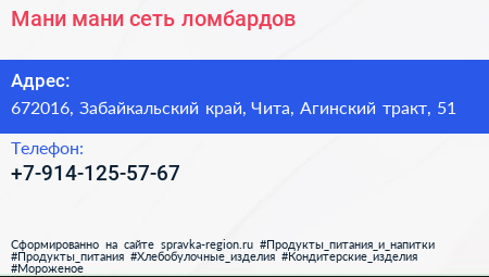 Мани-мани, сеть ломбардов по адресу 672016, Забайкальский край, Чита, Агинский тракт, 51 в дальнейшем Организация, размещена в следующих категориях: