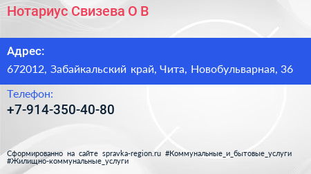 Нотариус Свизева О.В. по адресу 672012, Забайкальский край, Чита, Новобульварная, 36 в дальнейшем Организация, размещена в следующих категориях: