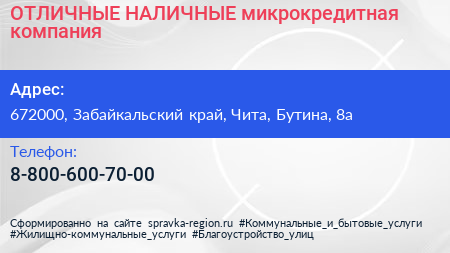 ОТЛИЧНЫЕ НАЛИЧНЫЕ, микрокредитная компания по адресу 672000, Забайкальский край, Чита, Бутина, 8а в дальнейшем Организация, размещена в следующих категориях: