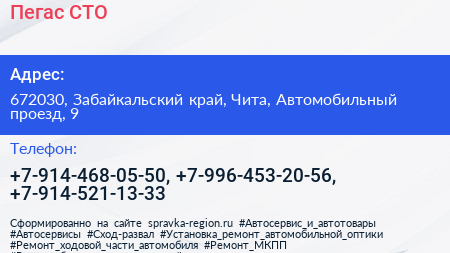 Пегас, СТО по адресу 672030, Забайкальский край, Чита, Автомобильный проезд, 9 в дальнейшем Организация, размещена в следующих категориях: