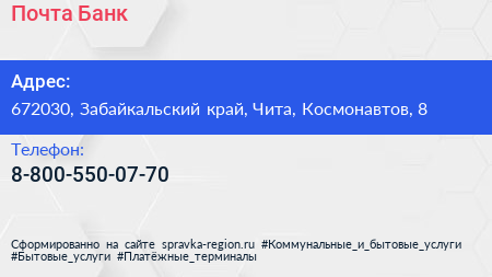 Почта Банк по адресу 672030, Забайкальский край, Чита, Космонавтов, 8 в дальнейшем Организация, размещена в следующих категориях: