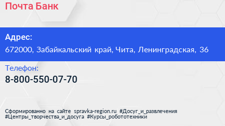 Почта Банк по адресу 672000, Забайкальский край, Чита, Ленинградская, 36 в дальнейшем Организация, размещена в следующих категориях: