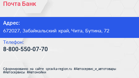 Почта Банк по адресу 672027, Забайкальский край, Чита, Бутина, 72 в дальнейшем Организация, размещена в следующих категориях:
