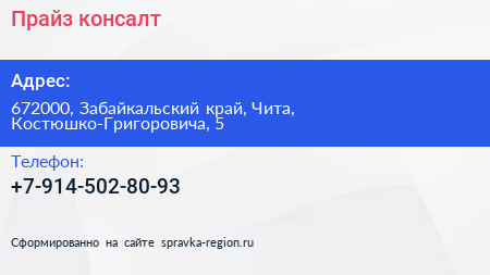 Прайз консалт по адресу 672000, Забайкальский край, Чита, Костюшко-Григоровича, 5 в дальнейшем Организация, размещена в следующих категориях: