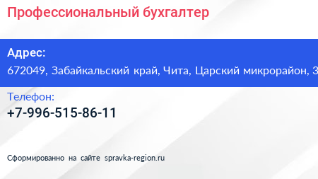 Профессиональный бухгалтер по адресу 672049, Забайкальский край, Чита, Царский микрорайон, 3 в дальнейшем Организация, размещена в следующих категориях: