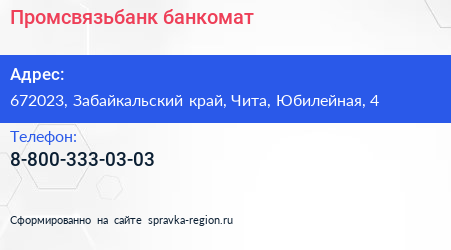 Промсвязьбанк, банкомат по адресу 672023, Забайкальский край, Чита, Юбилейная, 4 в дальнейшем Организация, размещена в следующих категориях: