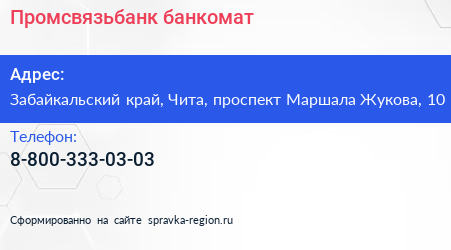 Промсвязьбанк, банкомат по адресу Забайкальский край, Чита, проспект Маршала Жукова, 10 в дальнейшем Организация, размещена в следующих категориях: