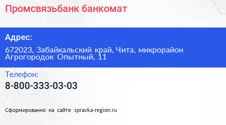 Промсвязьбанк, банкомат по адресу 672023, Забайкальский край, Чита, микрорайон Агрогородок Опытный, 11 в дальнейшем Организация, размещена в следующих категориях: