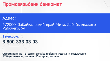 Промсвязьбанк, банкомат по адресу 672000, Забайкальский край, Чита, Забайкальского Рабочего, 94 в дальнейшем Организация, размещена в следующих категориях: