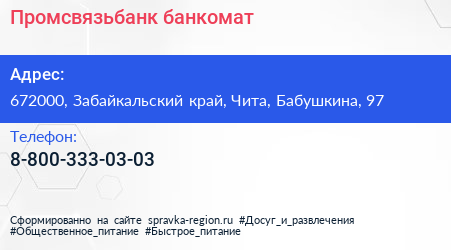 Промсвязьбанк, банкомат по адресу 672000, Забайкальский край, Чита, Бабушкина, 97 в дальнейшем Организация, размещена в следующих категориях: