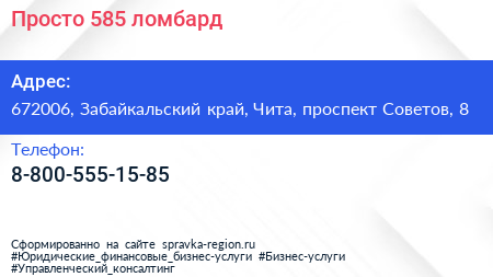 Просто 585, ломбард по адресу 672006, Забайкальский край, Чита, проспект Советов, 8 в дальнейшем Организация, размещена в следующих категориях: