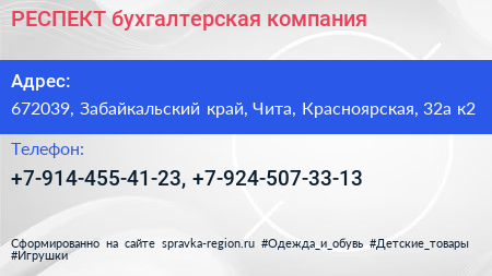 РЕСПЕКТ, бухгалтерская компания по адресу 672039, Забайкальский край, Чита, Красноярская, 32а к2 в дальнейшем Организация, размещена в следующих категориях: