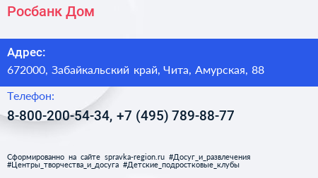 Росбанк Дом по адресу 672000, Забайкальский край, Чита, Амурская, 88 в дальнейшем Организация, размещена в следующих категориях: