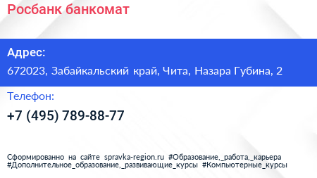Росбанк, банкомат по адресу 672023, Забайкальский край, Чита, Назара Губина, 2 в дальнейшем Организация, размещена в следующих категориях: