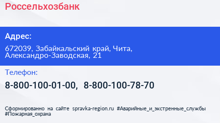 Россельхозбанк по адресу 672039, Забайкальский край, Чита, Александро-Заводская, 21 в дальнейшем Организация, размещена в следующих категориях: