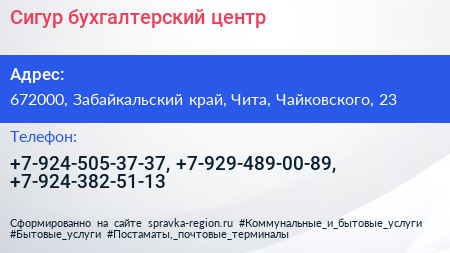 Сигур, бухгалтерский центр по адресу 672000, Забайкальский край, Чита, Чайковского, 23 в дальнейшем Организация, размещена в следующих категориях: