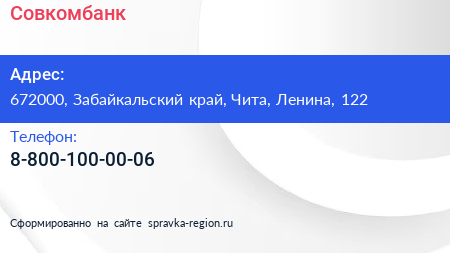 Совкомбанк по адресу 672000, Забайкальский край, Чита, Ленина, 122 в дальнейшем Организация, размещена в следующих категориях: