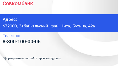 Совкомбанк по адресу 672000, Забайкальский край, Чита, Бутина, 42а в дальнейшем Организация, размещена в следующих категориях: