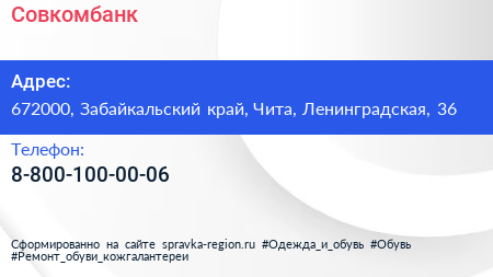 Совкомбанк по адресу 672000, Забайкальский край, Чита, Ленинградская, 36 в дальнейшем Организация, размещена в следующих категориях: