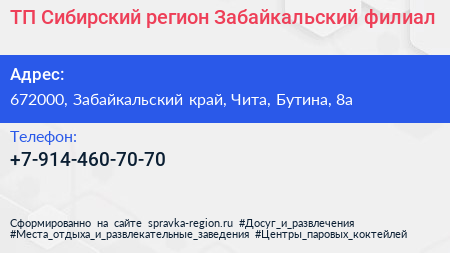 ТП Сибирский регион, Забайкальский филиал по адресу 672000, Забайкальский край, Чита, Бутина, 8а в дальнейшем Организация, размещена в следующих категориях: