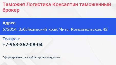 Таможня. Логистика. Консалтин, таможенный брокер по адресу 672014, Забайкальский край, Чита, Комсомольская, 42 в дальнейшем Организация, размещена в следующих категориях: