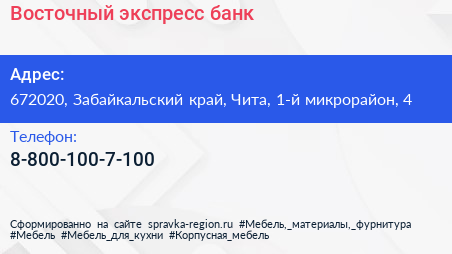 Восточный экспресс банк по адресу 672020, Забайкальский край, Чита, 1-й микрорайон, 4 в дальнейшем Организация, размещена в следующих категориях: