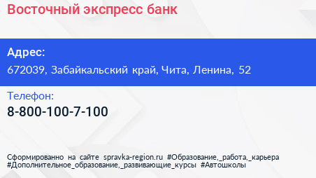 Восточный экспресс банк по адресу 672039, Забайкальский край, Чита, Ленина, 52 в дальнейшем Организация, размещена в следующих категориях: