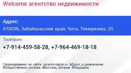 Welcome, агентство недвижимости по адресу 672038, Забайкальский край, Чита, Тимирязева, 25 в дальнейшем Организация, размещена в следующих категориях: