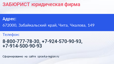 ЗАБЮРИСТ, юридическая фирма по адресу 672000, Забайкальский край, Чита, Чкалова, 149 в дальнейшем Организация, размещена в следующих категориях: