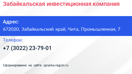 Забайкальская инвестиционная компания по адресу 672020, Забайкальский край, Чита, Промышленная, 7 в дальнейшем Организация, размещена в следующих категориях: