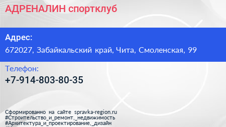 АДРЕНАЛИН, спортклуб по адресу 672027, Забайкальский край, Чита, Смоленская, 99 в дальнейшем Организация, размещена в следующих категориях: