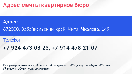 Адрес мечты, квартирное бюро по адресу 672000, Забайкальский край, Чита, Чкалова, 149 в дальнейшем Организация, размещена в следующих категориях: