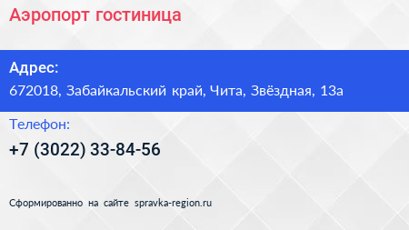 Аэропорт, гостиница по адресу 672018, Забайкальский край, Чита, Звёздная, 13а в дальнейшем Организация, размещена в следующих категориях: