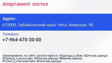 Апартамент, хостел по адресу 672000, Забайкальский край, Чита, Амурская, 98 в дальнейшем Организация, размещена в следующих категориях: