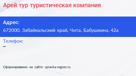Арей-тур, туристическая компания по адресу 672000, Забайкальский край, Чита, Бабушкина, 42а в дальнейшем Организация, размещена в следующих категориях: