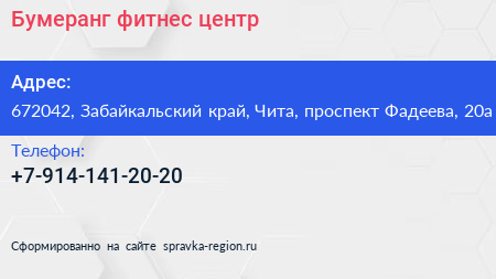 Бумеранг, фитнес-центр по адресу 672042, Забайкальский край, Чита, проспект Фадеева, 20а в дальнейшем Организация, размещена в следующих категориях: